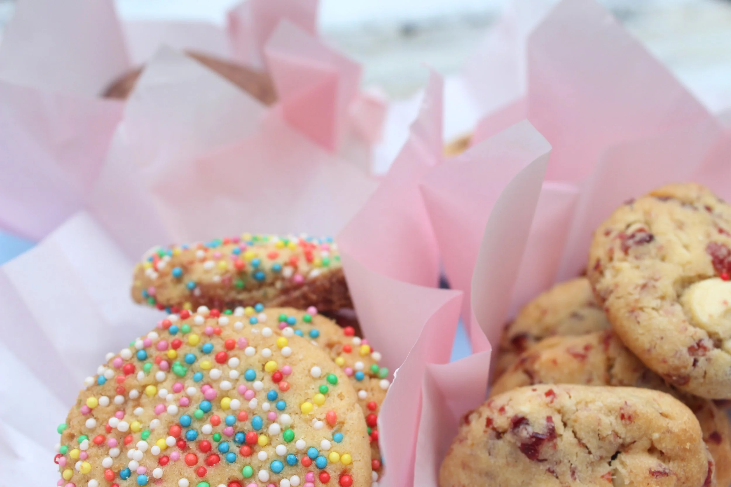 I chose Carnival Cookies with hundreds and thousands, Cranberry and White Chocolate Cookies, Chocolate with Chocolate Chip Cookies and Sultana and Cornflake Crisp Cookies.
