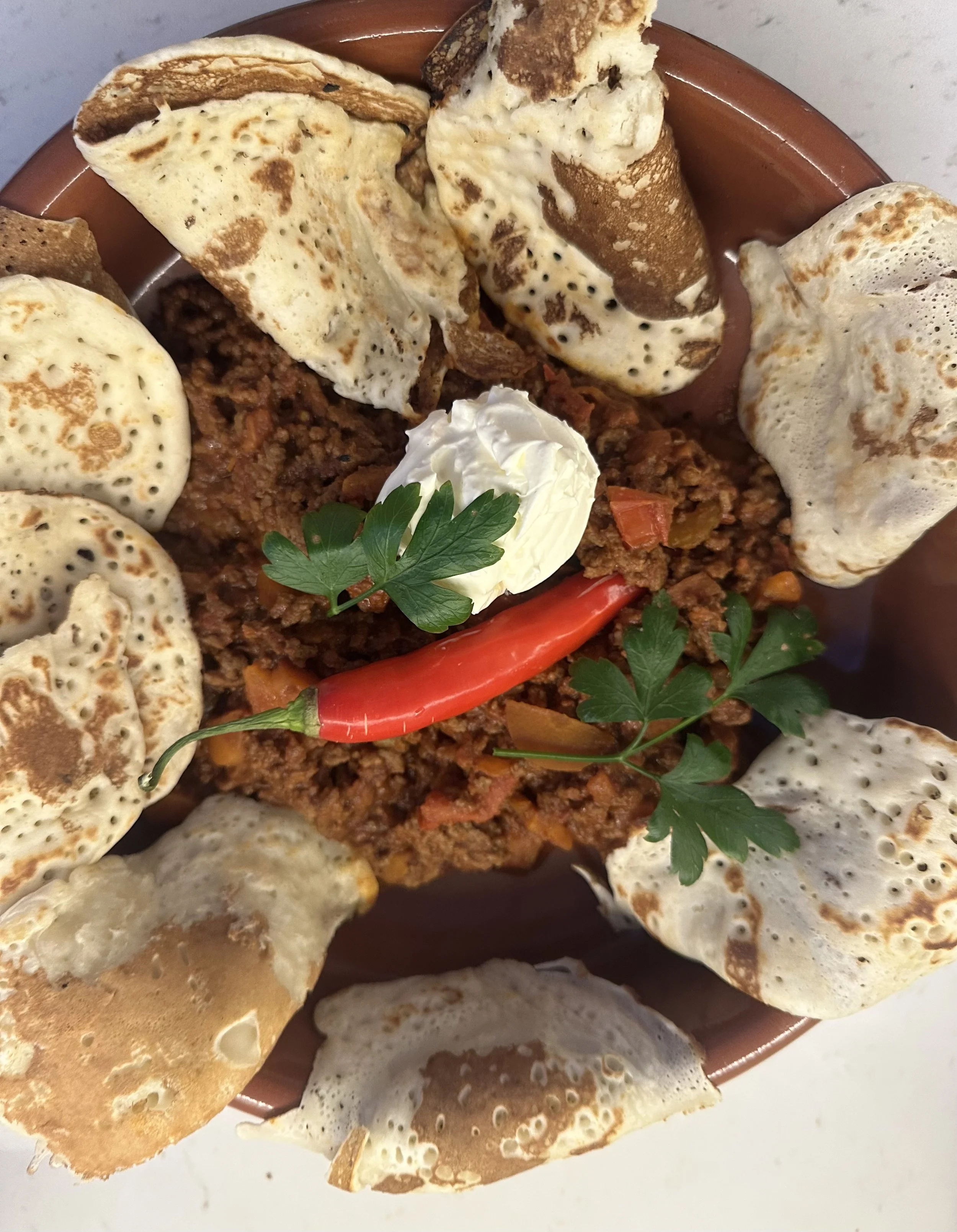 To serve, pile the chilli beef in a bowl or on a plate, with plenty of pancakes and some (optional) sour cream.