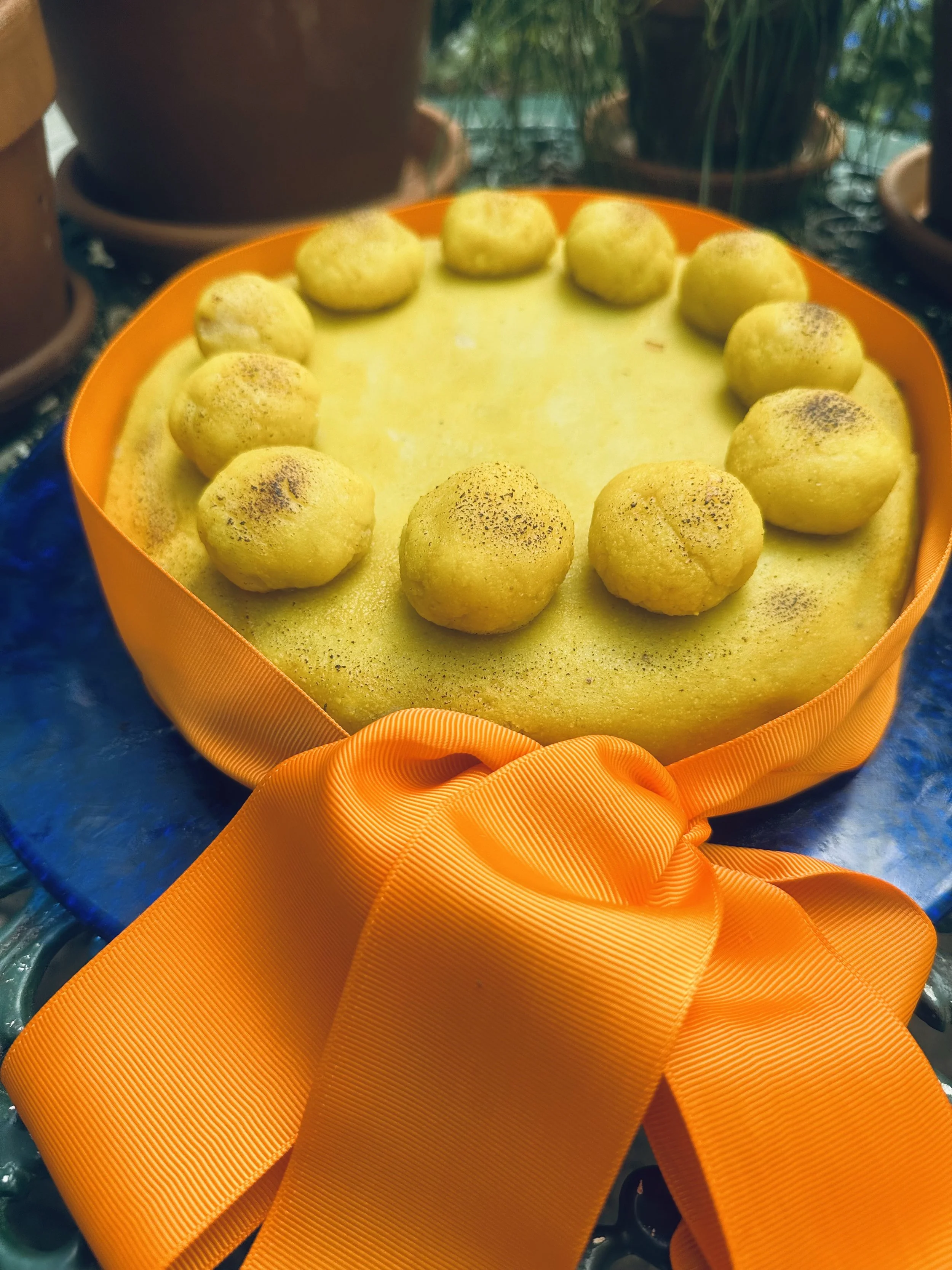 Place the cake onto a serving plate or board. Put a yellow ribbon – traditional – around the cake. I went for a green ribbon, with its associations of the renewal of life, appropriate for the Easter season.