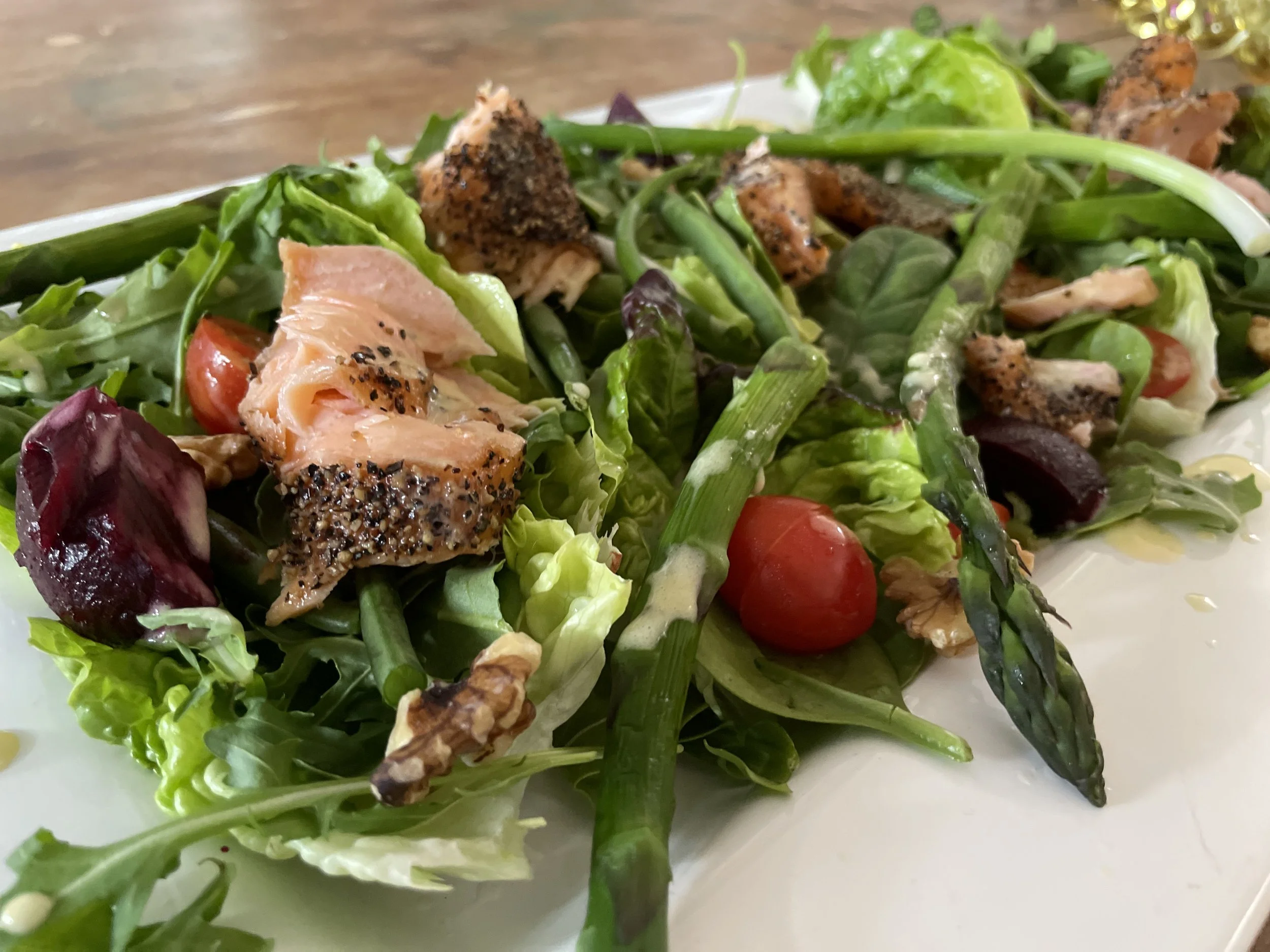 Assemble the salad by laying the lettuce leaves on a plate or platter, and placing the salmon pieces, tomatoes, beetroot and walnut pieces over the lettuce. Place the asparagus and spring onions on top of the salad. Sprinkle with sea salt and black pepper, then drizzle the salad with vinaigrette dressing to taste.