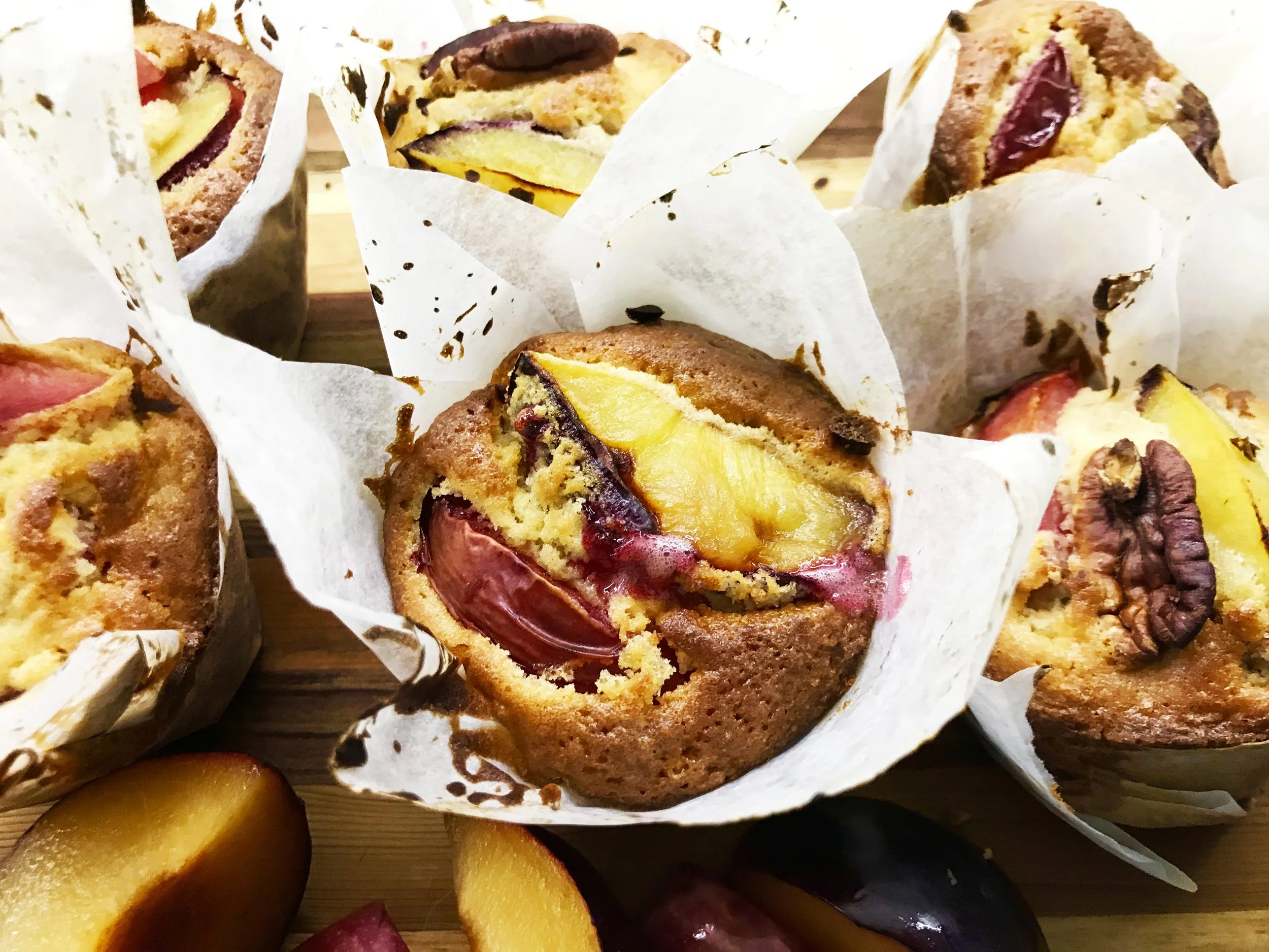 Grease a standard muffin tin and line 6 holes with squares of baking paper. Spoon in the muffin mixture, adding as many plum segments as you like on top to decorate, and pecan halves, if using.